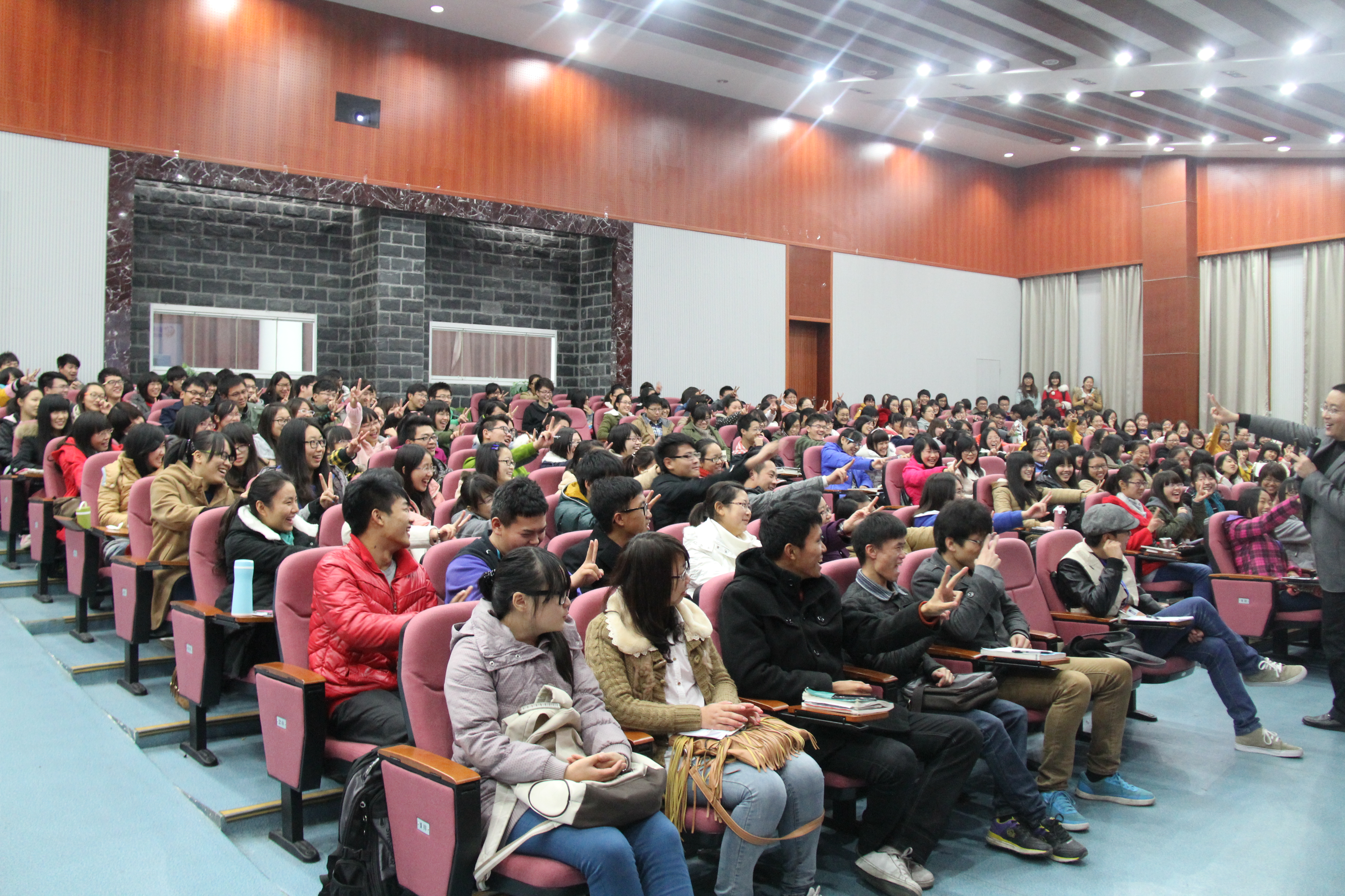 随着主持人的介绍,潘老师走到会场中央,讲座正式开始。首先,潘老师讲到了推销自己的问题,推销自己如同做自我介绍一般,潘老师拿自己本次的演讲举例,演讲的内容其实只占整个演讲过程的7%,而整个演讲中最为重要的是整个演讲者的精神面貌,肢体语言与语言的表现力,这才是让别人记住你的关键。接着,潘老师开始与大家一同分享自己的个人经历。21岁的潘老师专科毕业,从事的第一份职业是一名销售员,微薄的薪水,与不太爱好的职业,让潘老师很快放弃了第一份工作。之后潘老师进入金正集团工作,在一次与公司高层的谈话后,潘老师认识到了自己并没有要求高薪水的资格,只有尝试改变自己,完善自己才能够成就自己。就这样,潘老师做到了广东金正科技集团影音事业部市场部经理的职位。但在之后一次创业失败的经历中,潘老师陷入了迷茫,他反问自己到底这辈子应该从事一生的职业是什么,于是他参加了一次价格不菲的指导课程,这样的一次课程也改变了潘老师的一生。这个是世界其实很简单,潘老师说,能困住人的往往不是外在的东西而是人自己。像我们大学生学得多了,反而越来越封闭自己,越来越想用理性的思维去思考却忽略了人本来的内心。每个人都是神,因为不相信第一句话变成了人,的确,唯有怀着简单的心,简单的信,去观察世界,触摸世界,创造属于自己的世界,才能够真正的成就自己。潘老师提到了当代大学生的几个通病:忙而无果,盲目选择,方向迷茫,正是因为没有明确目标的结果。之后,潘老师向大家介绍了社会上的就业压力越来越大,而竞争,多变,速度是整个大环境的主旋律。在学历贬值,大学生贬值的今天,大学生的现状并不让人乐观。所以,潘老师喊出了必须变成精英这样的口号。紧接着,潘老师介绍了目标,能力,平台这三个大学生必须认真审视的大方面。注重提到了软硬实力的培养,与职业规划的问题。