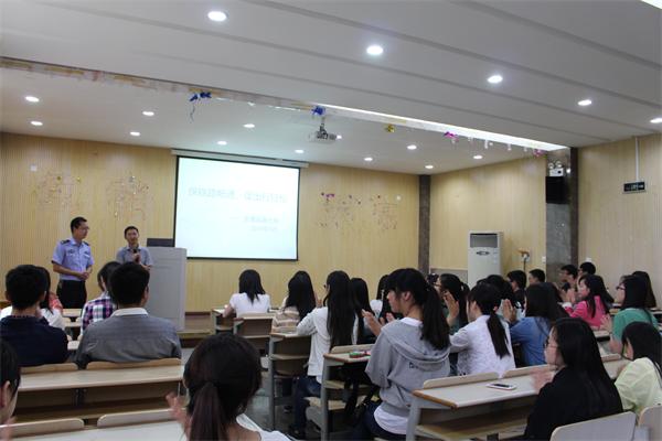 随后,铁路公安警官邀请同学们到大活报告厅进行铁路交通安全交流,进一步提高学生交通安全意识。宋警官作为主讲人,同时邀请各班生活委员到场旁听。针对校门口高铁铁路等相关交通问题,宋警官为大家讲述了基本交通安全知识。此外,应暑期将至,宋警官还为大家普及了网上购票方面的相关知识、提醒同学们有关乘车方面注意事项及出门安全问题。图文并茂的形式为活动宣传教育增添了色彩。提问环节结束后,交流会也在掌声中圆满结束。活动最后,南京铁路公安龙潭站派出所所长及相关铁路公安警官在大活报告厅合照留念。