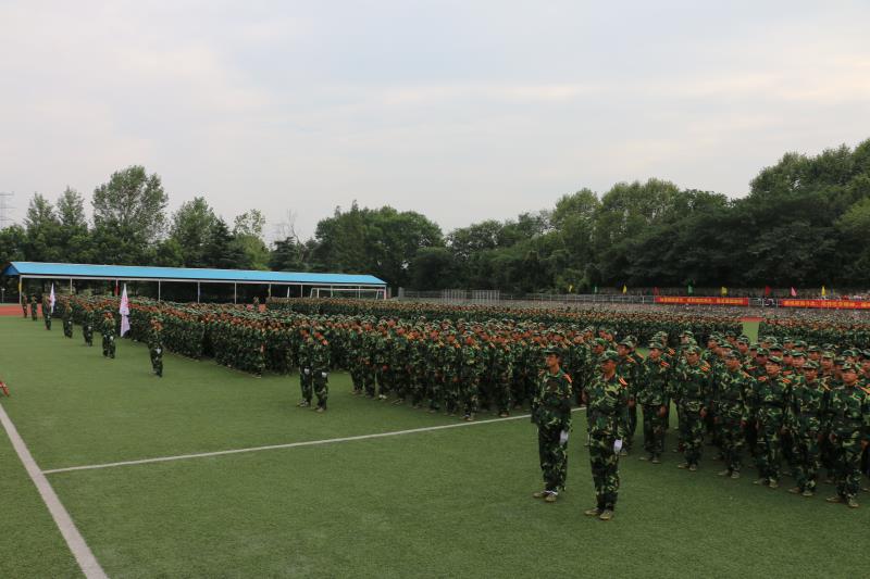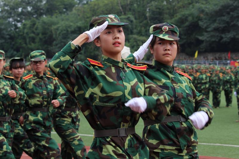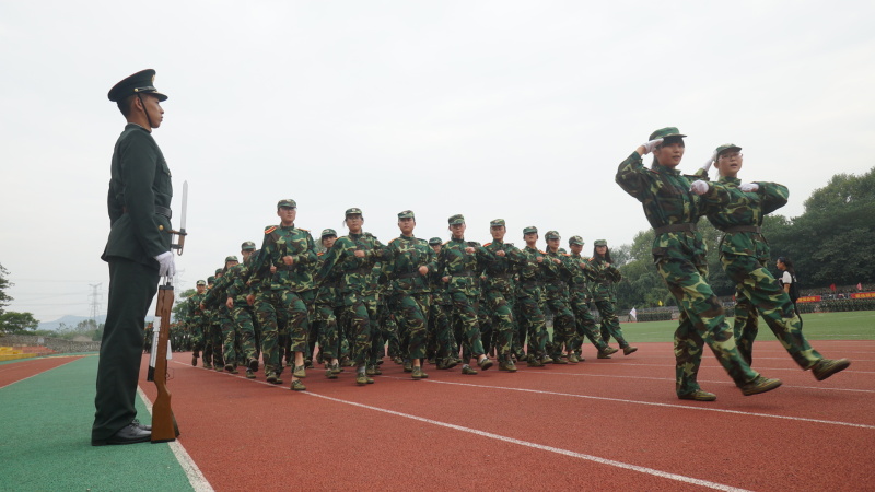 军训新生迈着铿锵有力的步伐昂首挺胸地走过主席台