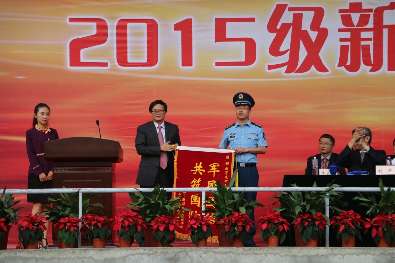 南京财经大学党委常委、副校长、红山学院理事长华仁海向解放军94994部队教导员韦国龙中校赠送锦旗。