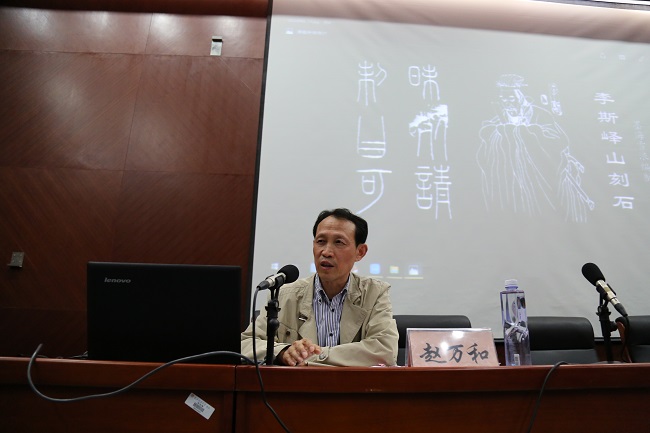 讲座开始,赵老师以一张张图片向同学们展现了汉字的形成与发展过程,深入浅出地讲述中国汉字文化源远流长的历史。接着,赵老师为我们介绍了汉字的各种构造方法,包括象形字、指事字、会意字等,他强调,中国汉字“形音译”结合,具有最深刻的文化内涵。与此同时,他特别提到在五四运动和改革开放这两个时期,中国为使国家经济文化与世界接轨,汉字文化一度受到了巨大冲击与挑战。对此他表示,汉字是中华文化必不可少的组成部分,呼吁同学们发扬传统文化、传承中国汉字。其次,赵老师还深入阐释了中国传统文化与书法的关系,举例说明了儒家、道家和佛家对书法审美准则及韵味内涵的深刻影响。赵老师还就如何学习书法和学习书法的益处提出自己看法与建议,鼓励同学们刻苦练字以修身养性,注重提高道德情操,修炼字外功夫。