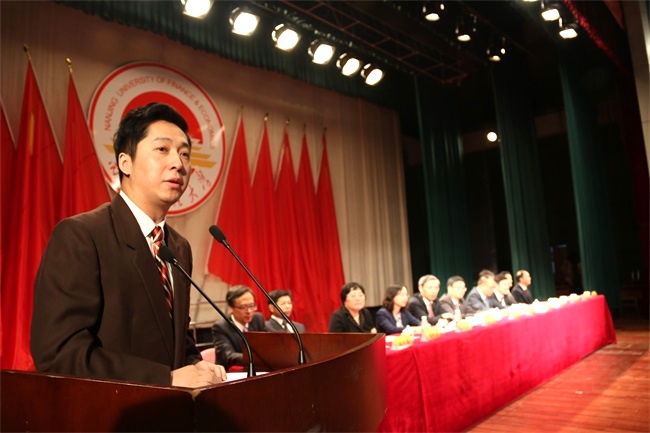 我院金融2003B班毕业生、江苏省镇江市人民政府金融工作办公室综合规划处处长成楠同志作为校友代表发言