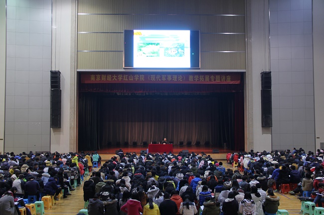 12月19日18时30分,我院《现代军事理论》教学拓展专题讲座于文体馆成功开展。本次讲座的主讲人为南京大学军事教研室杨新教授,全体大一新生参加讲座。讲座由团委副书记胡新蕲老师主持。