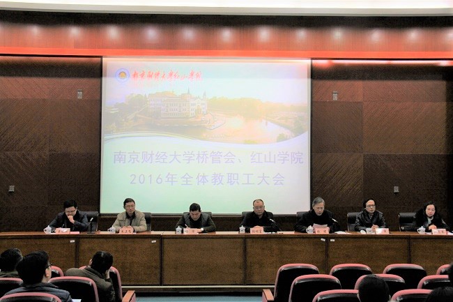 12月29日下午,南京财经大学桥头校区管理委员会、红山学院2016年教职工大会在桥头校区四教报告厅召开。桥头校区管理委员会、红山学院全体领导及教职工参加了大会。大会由桥头校区管理委员会主任、红山学院党委书记鞠明富主持。