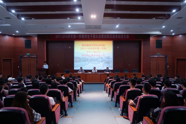 9月5日下午,我院新学期学生干部大会暨迎新生志愿者动员大会在四教报告厅召开。南京财经大学桥管会主任、红山学院党委书记鞠明富,桥管会副主任朱正飞、学生处处长邱宁出席会议。院团委相关工作人员及全体学生干部参加会议。会议由团委田仁连老师主持。
