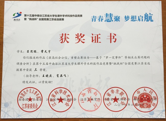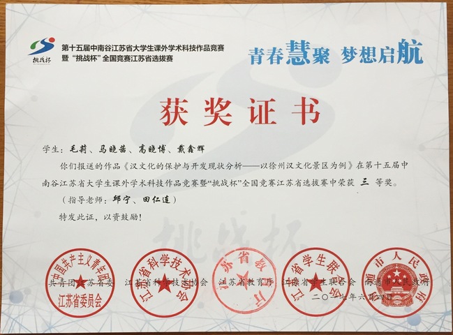 为做好第十五届“挑战杯”竞赛的作品选拔推荐工作,院团委自2016年11月启动我院“挑战杯”课外学术科技作品竞赛活动,历经8个月时间,认真组织活动立项、申报和评审工作,通过多种形式的广泛宣传动员,组织学生积极报名并在教师指导下完成所选课题,历经严谨公正的作品评审和对优秀作品的修改完善,最终我院报送的作品《提高社会公信,重塑众筹活力——基于“罗一笑事件”等相关众筹问题的调查分析》(团队成员:吕思聪、常天宇;指导教师:王晓庆、肖亚飞)及《汉文化的保护与开发现状分析——以徐州汉文化景区为例》(团队成员:毛莉、马晓茜、高晓博、戴鑫辉;指导教师:邱宁、田仁连)于第十五届“挑战杯”江苏省决赛中双双荣获三等奖。