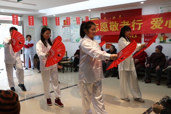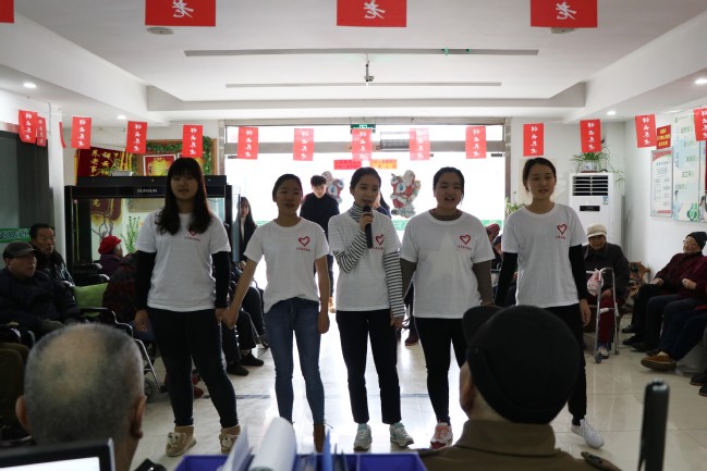 抵达公寓,志愿者们便自行找老人们聊天并邀请他们观看表演。当志愿者们搀扶老人就位后,表演正式开始。男女主持各带一队,有充满活力的健身操《拍拍操》,有婀娜婉转优美舞姿的民族舞蹈《恋人心》以及当下老人们最热爱的广场舞《如果感到幸福你就拍拍手》,在观看极富感染力的舞蹈过程中,老人们的掌声也不绝如缕,现场气氛十分热烈。一首悦耳动听的《我要你》使老人们感受听觉的盛宴,老人听黄梅戏《女驸马》听得是如痴如醉,《月亮代表我的心》则让老人不由自主地跟着节奏拍起手掌,而经典红歌《东方红》更是引起老人一同歌唱。