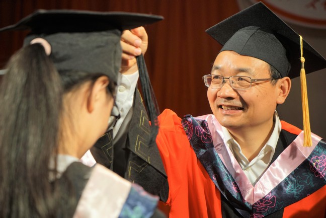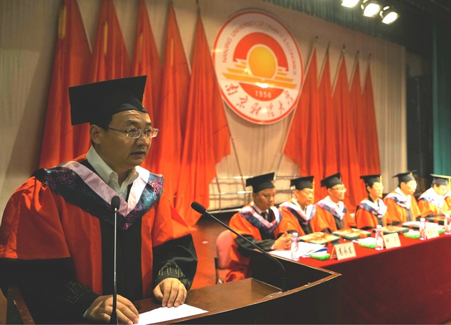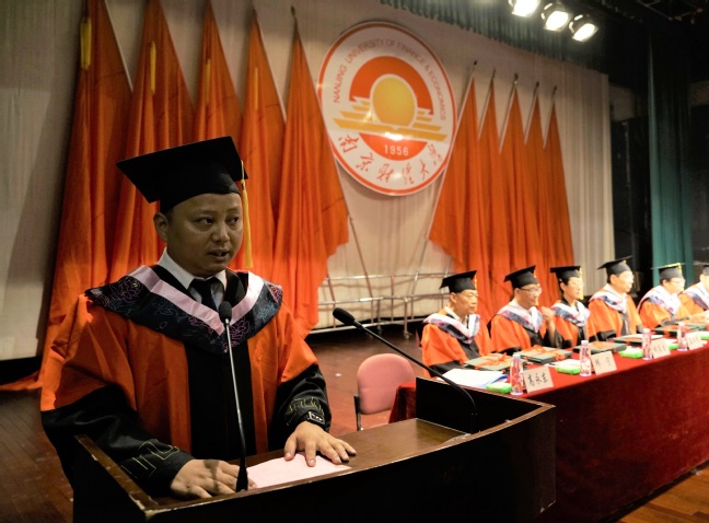 金融1451班陈志刚同学和会计1456班韦苏格同学作为学士学位获得者代表分别发言。他们回忆了在红山四年学习生活的点点滴滴,感谢母校给予了他们独立思考的能力、坚定的社会责任感和从容的平常心态。最后,他们号召全体毕业生谨记师长的教诲,与“自谦、自信、务实、超越”的校训相伴,带着勇敢的心不断地向前!
