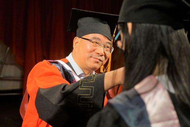 南京财经大学红山学院院长李连军为毕业生授予学士学位证书并毕业生拨过学士帽上的流苏