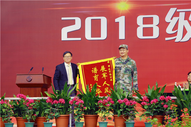 南京财经大学党委常委、副校长、红山学院理事长华仁海教授向解放军临汾旅赠送锦旗