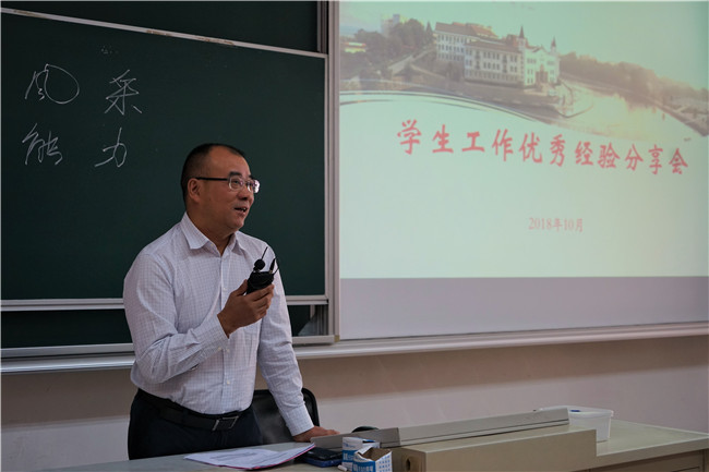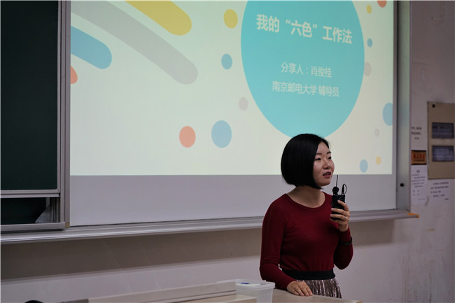 肖俊桂老师作主题为“我的‘六色’工作法”的经验分享。学生工作中,要有白色的中立和客观、蓝色的控制与组织,也要有红色的热情、黄色的乐观、黑色的谨慎和绿色的创新。