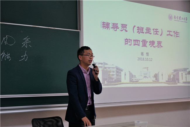 杨恒老师作关于辅导员和班主任工作四重境界的经验分享。辅导员和班主任既肩负着学生和学校的现在,也肩负着家庭和祖国的未来。辅导员和班主任要“真爱”学生,既要做舌尖上的“哨子”、脚尖上的“梯子”,笔尖上的“镜子”,还要能播撒心尖上的“种子”。