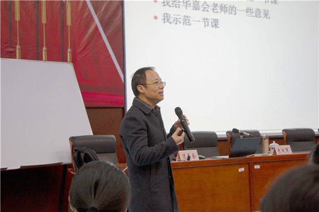 李政军教授首先认真观看了我院国际经贸系华嘉会老师的现场教学演示,并提供优化指导建议,亲身示范授课。随后,他分析讲好一堂课的意义,阐释优质课堂的特点,给出打造金课的策略。李政军教授认为,教师要讲好一门课必须做到以下几点:一是要明确课程目标,保证课堂教学的方向、层次感,且逻辑连贯;二是要更新教育观念,注重提升学生逻辑思维,做学生学习能力培养的引路人;三是要在日常生活中凝炼学科知识,加强学科间知识迁移与融合,提高知识的关联度。