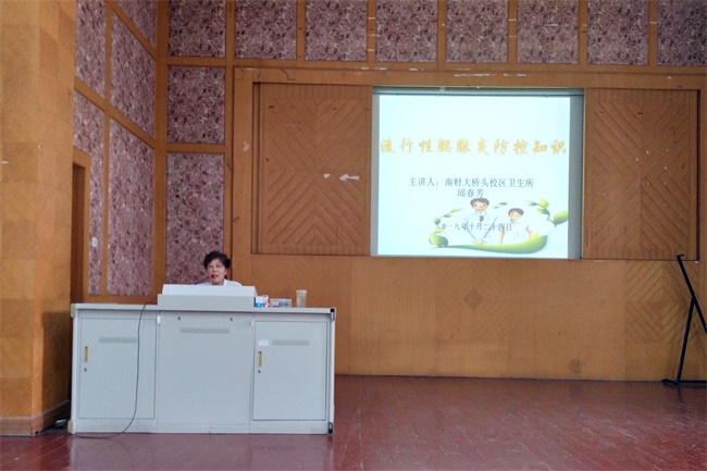 10月24日上午,我院桥头校区卫生所邱春芳医生在三教报告厅开展流行性腮腺炎防控及秋冬季传染病预防知识讲座,学生及宿管人员近200人参加。