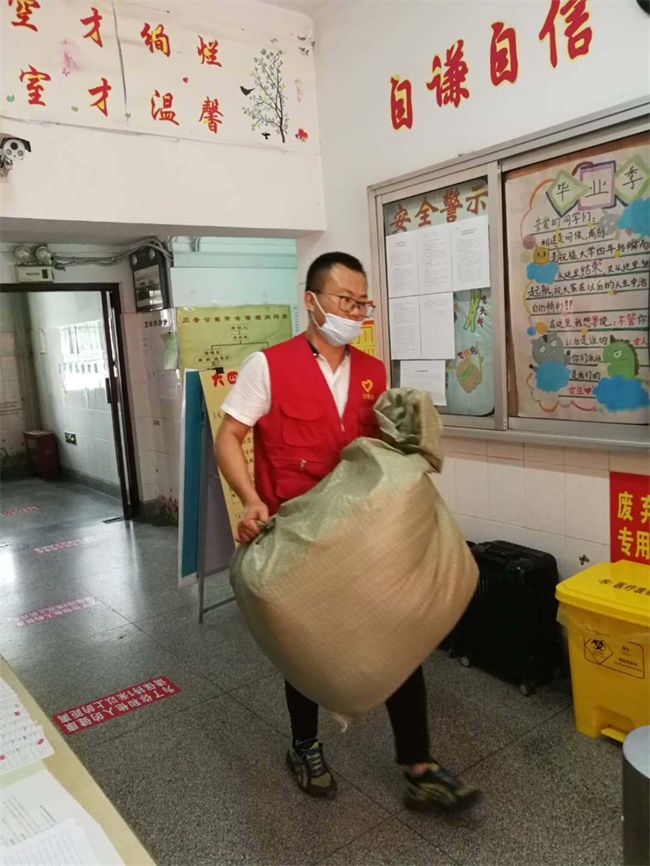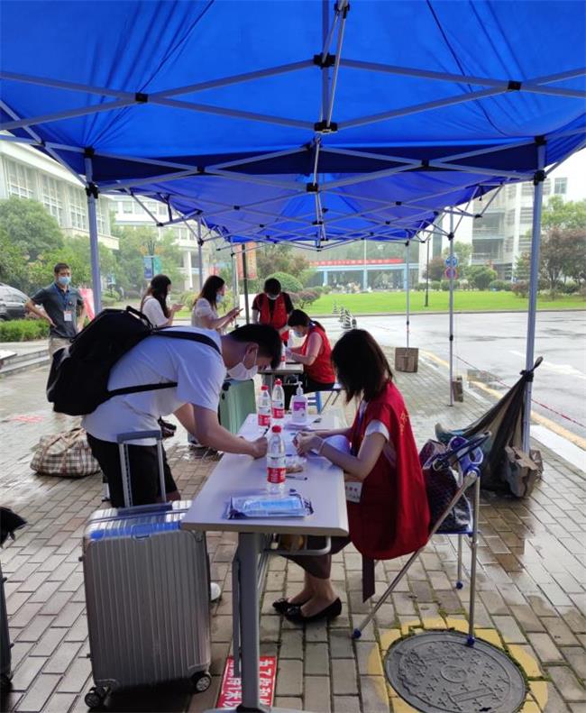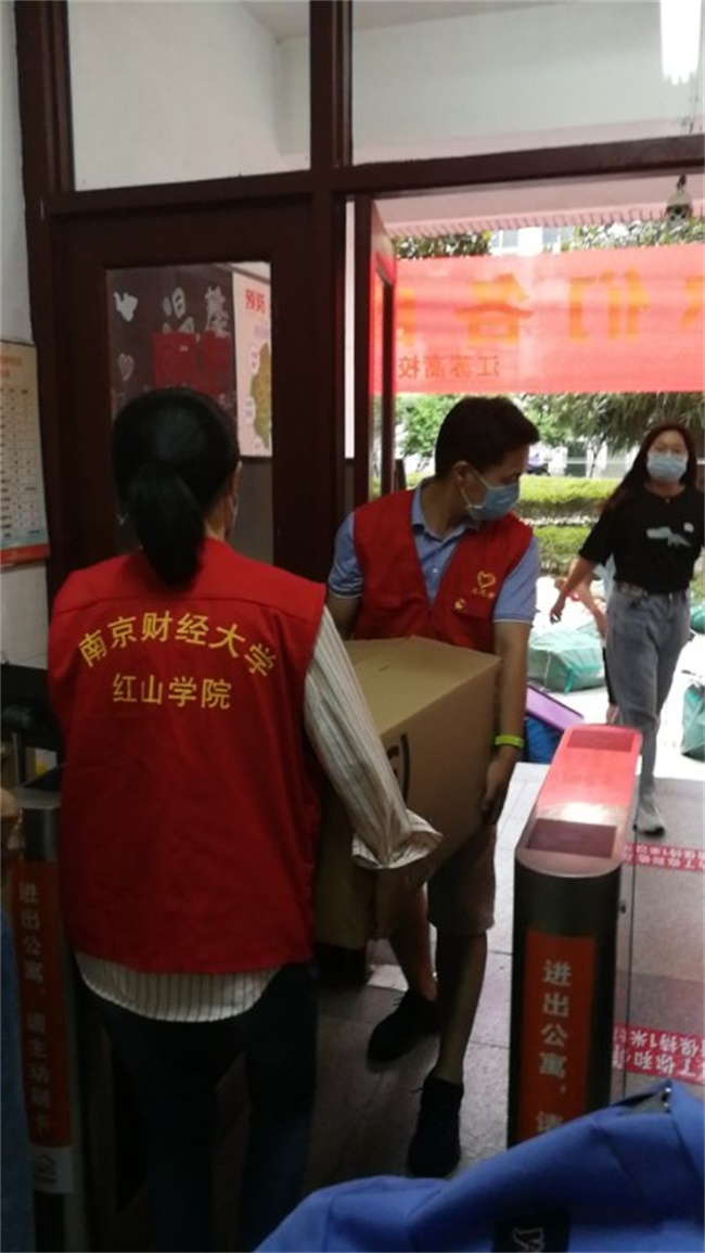 在校园门岗,党员志愿者帮助核实学生身份信息,检测体温,查验“苏康码”以及“行程卡”,发放校园通行证,引导交通。在宿舍区,党员志愿者帮助学生打包行李、张贴标签、搬运下楼。夏日炎炎,志愿者们一趟趟地往返宿舍与转运点,热心帮助同学、家长,广大同学、家长纷纷表示感谢。