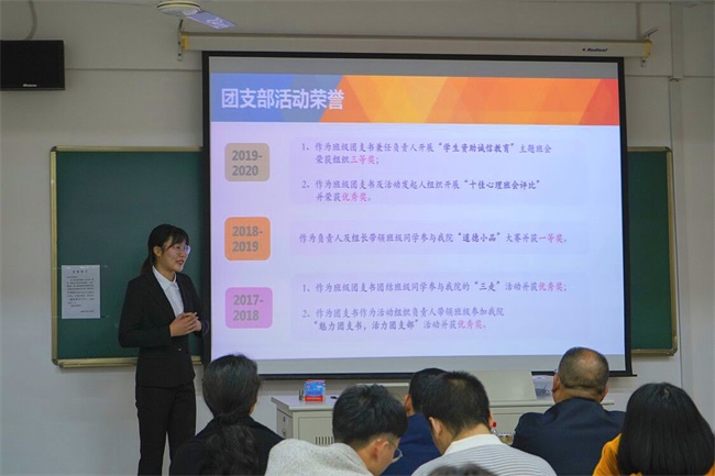经个人申报、辅导员推荐、学生处审核等环节,13名同学参加本次答辩会,部分学生代表现场观摩。答辩会分为个人陈述、评委提问两个环节。答辩学生主要从思想政治、学业成绩、所获荣誉、第二课堂、社会实践等方面进行陈述;评委则通过提问更深入地了解答辩学生的情况。