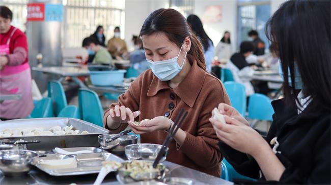 在食堂大厨师傅的指导下,院团委老师与学生干部、志愿者同学分成十余个小组,纷纷参与到活动中来。师生们一边包饺子一边话家常,畅聊生活与学习,大家欢声笑语其乐融融,温馨如家。食堂工作人员提前精心准备了食材,有荠菜馅儿、大白菜馅儿的饺子,还有芝麻馅儿的汤圆,热乎乎的节日餐在学生食堂免费派发,现场排队领取的每一名同学脸上都洋溢着喜悦。工作人员在送上汤圆、水饺的同时,也送上了对老师和同学们的节日祝福,同学们向辛勤忙碌的工作人员道上真诚的感谢。一份份热腾腾的水饺和汤圆,满载着浓浓的“家”的味道和暖暖师生情。水饺汤圆鲜香扑鼻,冬至温暖于校园传递。