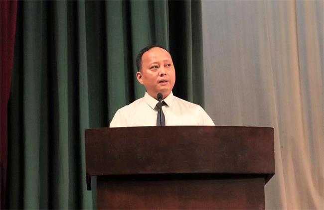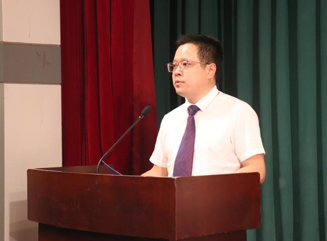教师代表、会计系党支部书记孙海燕发言,她希望同学们做有道德、懂自律、有目标、内心强大的人,向初心前行,披荆斩棘、乘风破浪,在百年未有之大变局中书写青春力量。
