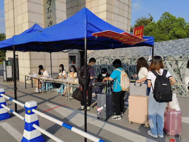 院领导亲切慰问现场工作人员及学生志愿者,叮嘱各部门要确保学生疫情防控“加固”、教育管理“加强”,服务保障“加码”,全力以赴把好“入校关”。