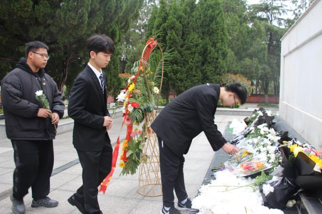 上午9时40分,祭扫活动正式开始。在烈士陵园纪念碑广场前,青年师生庄严肃立,齐唱国歌。国歌声毕,青年学生代表相雨欣、张翔发言,他们表示,烈士已逝,然精神长存,新时代青年应当牢记历史,传承和弘扬先烈的革命精神,勇于担起建设祖国的重任。全体师生在纪念碑前默哀,并敬献花束。随后,青年师生来到各烈士碑前,深深鞠躬并为烈士擦拭墓碑,表达对烈士们的深切悼念和无限敬仰。