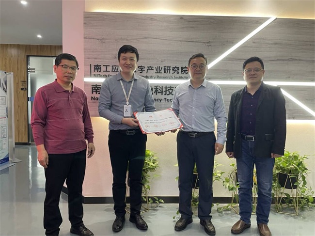 我院李连军院长为钱城江常务副总颁发江苏省产业教授(本科类)聘书