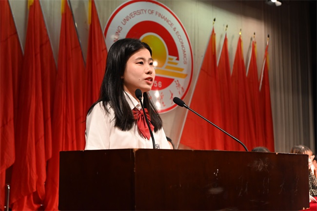 税收2152班李惠代表全体在校生祝愿学长学姐们以梦为马,不负韶华,一鸣从此始,相望青云端。人资1951班陈国庆、会计1957班金翠翠同学代表全体毕业生发言,他们感恩母校四年的辛苦培育,表示纵使前路有荆棘,亦将永葆初心,凝心聚力、锐意进取。