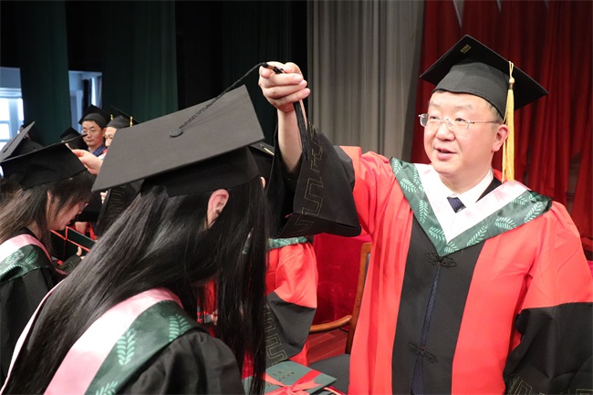 学位授予仪式随后分两场举行,学院党委书记孙彬、院长李连军分别参加学位授予仪式并致辞。学位授予仪式分别由会计系学工秘书王颖老师、国际经济与贸易系学工秘书宋婧老师主持。会计系系主任孟翠湖、工商管理系系主任张太海分别宣读学位授予决定。在欢快的《进行曲》乐声中,院领导、老师为2023届毕业生一一拨穗,授予学士学位证书。