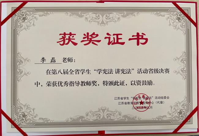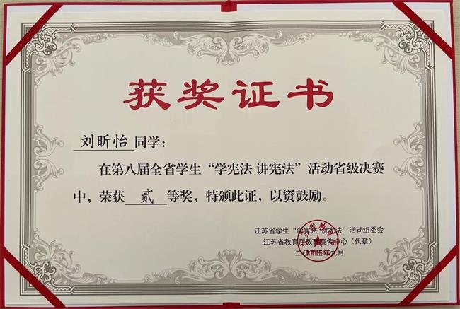 9月23日至24日,第八届全省学生“学宪法 讲宪法”活动省级决赛在南京审计大学浦口校区举行,经过层层选拔与激烈角逐,我院文法系法学2151班刘昕怡同学凭借在初赛中的亮眼表现,突出重围,喜获第八届全省学生“学宪法 讲宪法”活动省级二等奖,文法系系主任李磊老师荣获优秀指导教师奖。