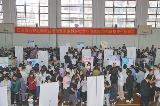 10月18日下午,江苏省百校联动就业活动暨南京财经大学红山学院2024届毕业生招聘会于福建路校区体育馆举办。江苏滨海农村商业银行股份有限公司、常州天合智慧能源工程有限公司、江苏泸溪河食品科技有限公司、南京万得资讯科技有限公司、华龙证券股份有限公司江苏分公司等多家用人单位参展,涵盖金融、制造、管理类等各行业,我院大三、大四学生积极参加。