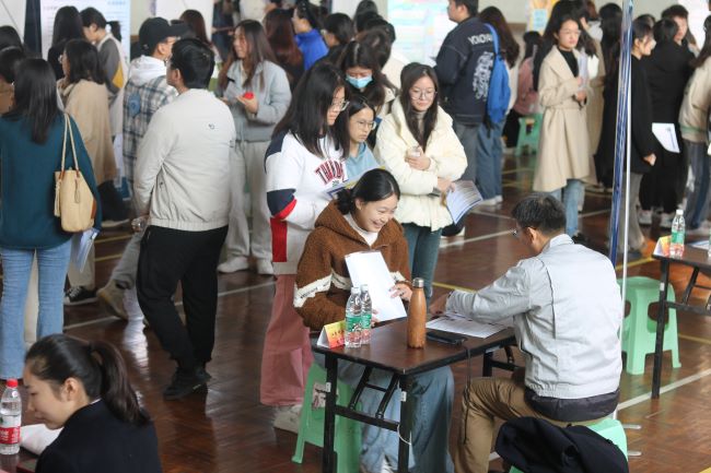 招聘会现场,毕业生携带简历,积极寻找心仪岗位,争取就业机会。大三学生也纷纷与企业互动交流,了解就业前景。参会单位招聘负责人热情接待咨询学生,通过海报、宣传册及面对面交流等方式向学生介绍单位概况及岗位要求、薪资待遇和职业发展前景,招聘会在友好热烈的氛围下有序进行。