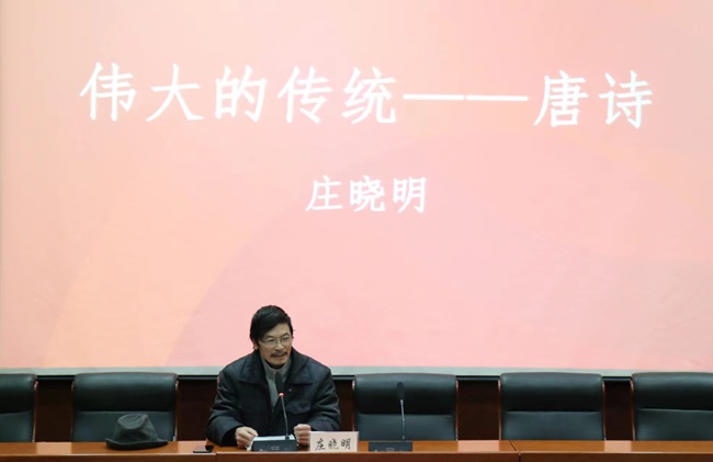 庄晓明老师以唐朝的诗人和诗作为例,为师生讲解了唐诗的发展历程,详细阐了唐诗创作的时代背景、创作缘由以及对后世的深远影响。他希望师生从唐诗这一伟大传统中汲取养分,为学习和生活积累丰富的素材。并强调,当代青年应当充分亲近、理解唐诗,领略唐诗的无穷魅力,充分发挥唐诗在青年成长世界观与价值观养成中的价值引领作用。