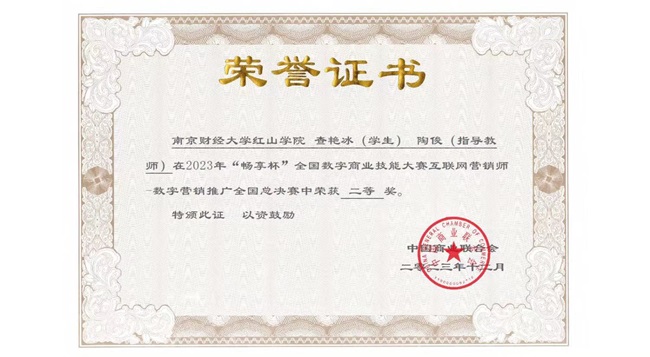 12月24日,2023年“畅享杯”全国数字商业技能大赛互联网营销师数字营销推广全国总决赛结果揭晓,我院工商管理系陶俊老师指导的营销2051王刚同学、营销2151查艳冰同学、营销2152陶硕同学荣获全国总决赛二等奖。