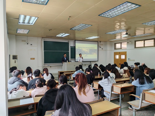 为帮助学生了解当前数智时代发展趋势,引导学生树立“先就业再择业”的就业观,助力学生更好地规划职业发展,4月23日下午,在福建路校区J2-304顺利开展“数智时代下的大学生职业发展规划指导”为主题的职业生涯规划和就业指导讲座,南京智方信联信息科技有限公司总经理陶亚宁应邀主讲,国际经贸系党总支副书记陈玉龙主持,大三大四学生踊跃参加。