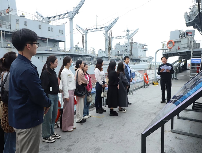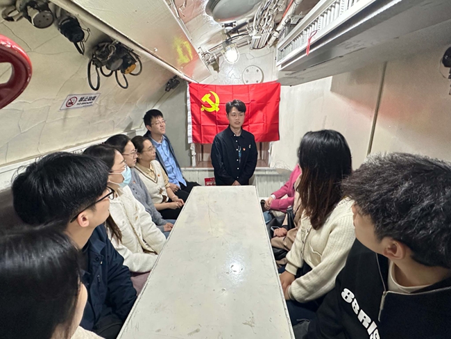 马克思主义教学部主任、党总支书记金怡顺在参观海军舰艇文化园时,讲述了人民海军从初步建设到现代国防体系完善的历程,使在场师生全方位、全过程、全景式地感受了人民海军在中国共产党的领导下,从无到有、从小到大、从弱到强,一路劈波斩浪的创业史、奋斗史和发展史。在274潜艇会议室,青马班詹尹恒同学开展了“国家安全 挺硬担当”的团课宣讲,围绕总体国家安全观的提出及发展、总体国家安全观的核心要义、国家安全法律知识等方面进行了讲解,通过生动的案例讲解,让大家真实了解国家安全的内涵,号召团员青年坚定不移走中国特色国家安全道路,勇于为维护国家主权、安全、发展利益挺硬担当。