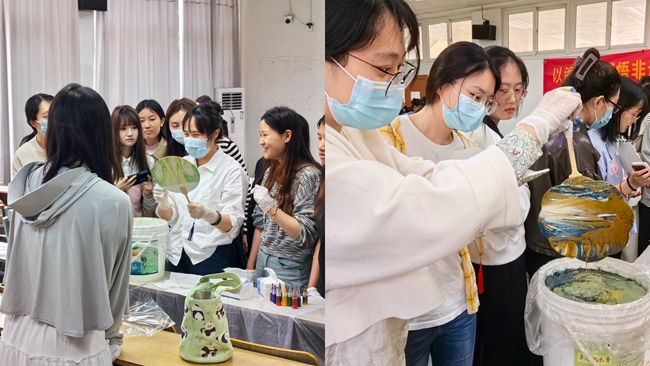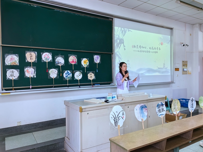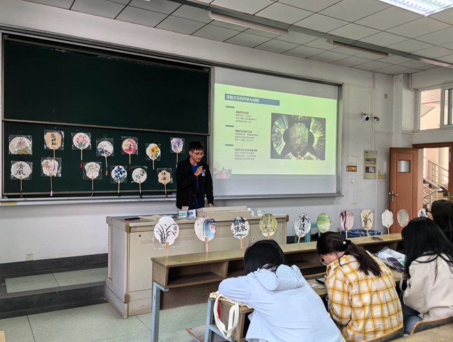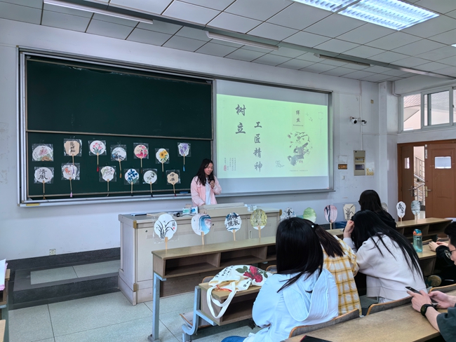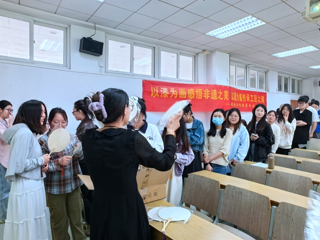 随后,邱丹老师为大家介绍了中国扇的历史沿革以及非遗漆扇文化的独特魅力。她详细讲解了扇子的制作工艺和背后的文化内涵,让师生们对中国扇文化有了更深入的了解。