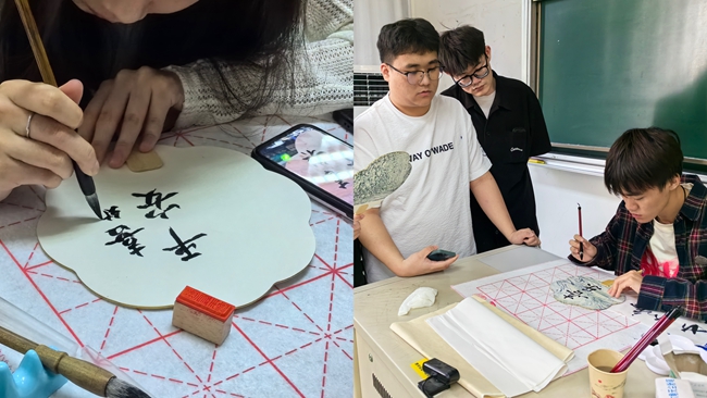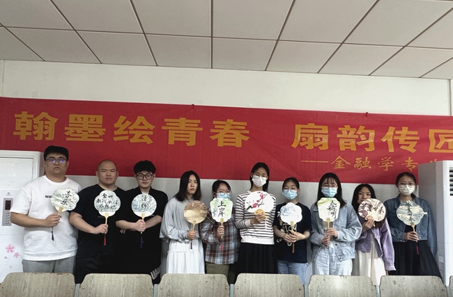 在扇面题字环节,税收2153班的叶晨阳同学、物流2151班的田锦楠同学和工商2152班的沈唐杰同学担任了指导,他们耐心地指导师生们在扇面上题写诗句或祝福语,师生们将自己的情感和愿景寄托在精美的扇面上,用笔墨书写出对传统文化的热爱和尊重。