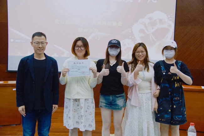 会计系学生会主席孙一钧、厚薄财经协会会长陈好为优秀奖队伍颁奖