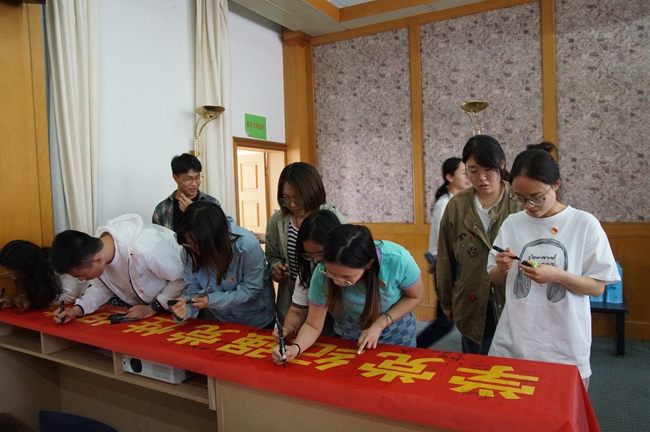 在鲜红党旗的见证下,现场师生在印有“学党纪强党性 担使命做先锋”的横幅上纷纷签上自己的名字,用实际行动表达对遵规守纪的信心与决心。