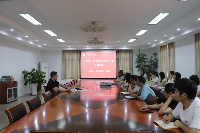 6月4日,我院行政第一党支部在桥头校区行政楼311会议室召开党纪学习教育专题党课。本次党课由南京财经大学桥管会主任、学院党委书记孙彬主讲,行政第一党支部全体党员参加。党课由党委办公室、院长办公室副主任,第一党支部书记范书玉主持。