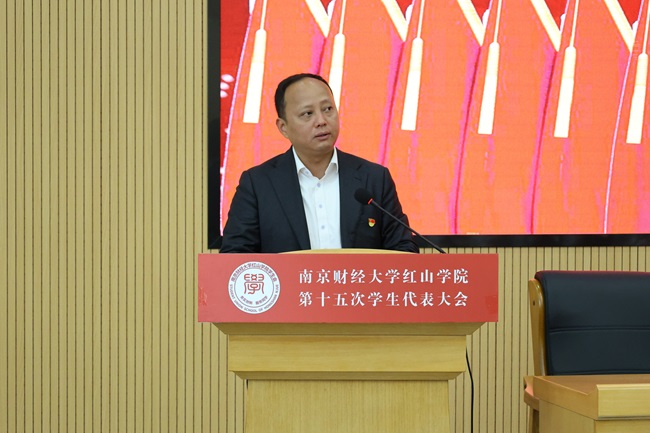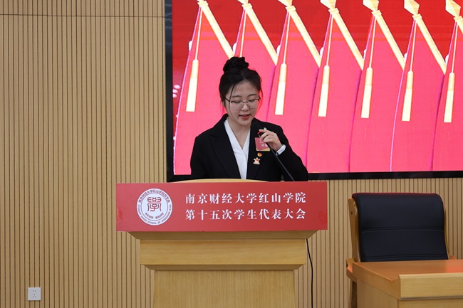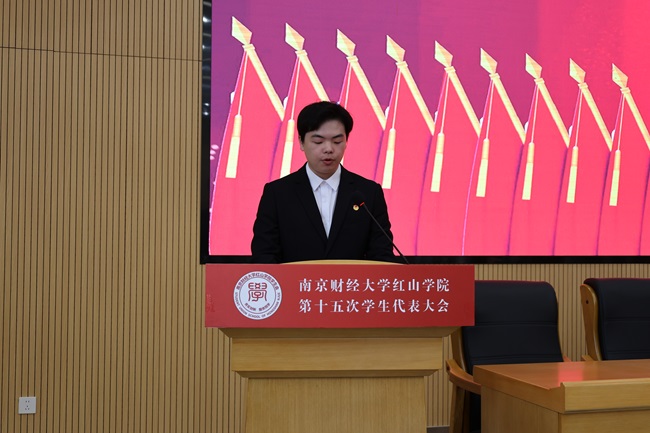 南京财经大学学生会主席团候选人杨泽宇致辞。他期待红山学院新一届学生会始终牢记服务同学的初心,勇担责任,笃行致远,书写属于红山青年的崭新篇章。