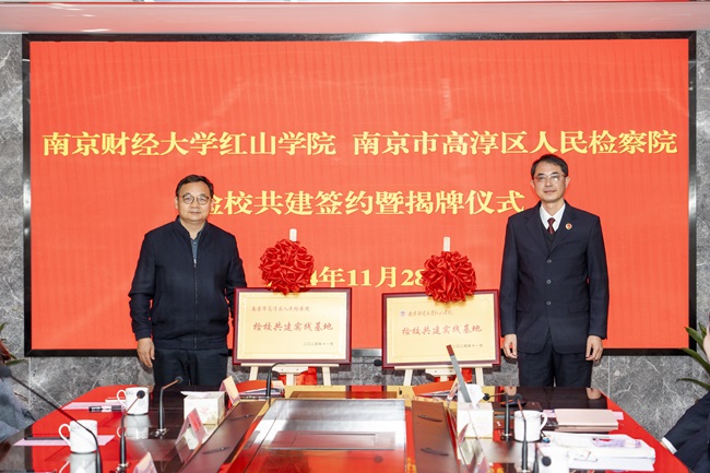 仪式上,南京财经大学红山学院院长李连军与高淳区人民检察院党组书记、检察长徐进共同签署了《检校共建协议书》,并为“南京财经大学红山学院检校共建实践基地”“南京市高淳区人民检察院检校共建实践基地”揭牌。与会人员还就如何深化检校共建合作、扩展理论研究领域、搭建人才培养平台和具体检察业务进行了深入交流座谈。