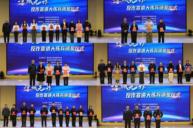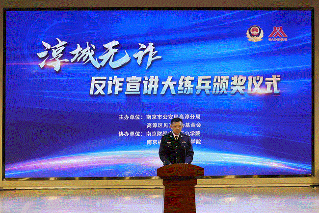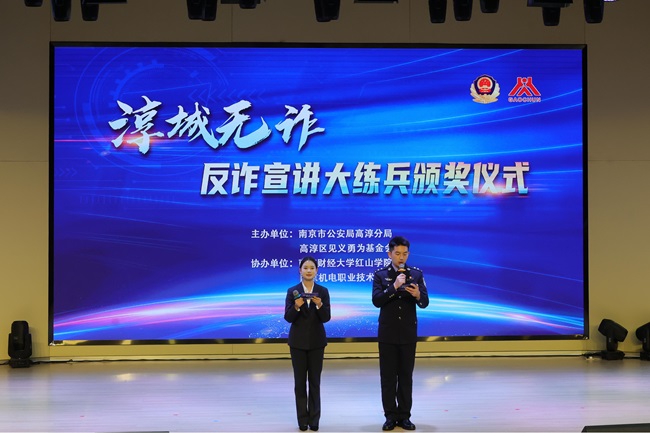 12月18日,由南京市公安局高淳分局、高淳区见义勇为基金会主办,南京财经大学红山学院、南京机电职业技术学院协办的“淳城无诈”反诈宣讲大练兵颁奖活动在我院鹿鸣剧场成功举办。高淳区政府党组成员、公安分局局长陆炼,高淳区原政法委书记、见义勇为基金会理事长张毓华,南京市公安局反诈支队党委书记、支队长张蔚,高淳区各街道公安分局局领导,区妇联、农商行领导,各镇街政法委员,南京财经大红山学院院长李连军、副院长朱正飞出席颁奖仪式。