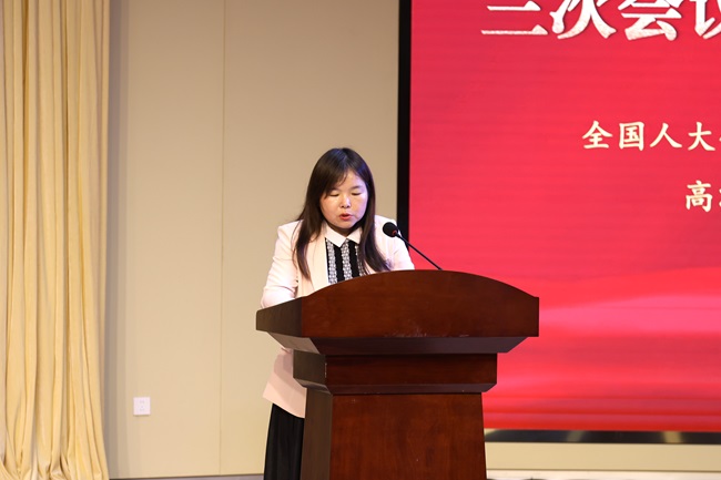 王晨婷副书记致辞。她代表学院向人大代表邢青松莅临我院宣讲表示热烈欢迎和衷心感谢。她指出,刚刚闭幕的全国两会,是在实现“十四五”规划目标任务的关键之年召开的一次重要会议。习近平总书记在全国两会期间发表的一系列重要讲话精神,为高校和青年学生指明了努力方向。她对参会师生提出三点希望,一是要把“听讲”变成“思考”。不仅要“听”两会精神,更要“想明白”“做起来”。带着问题去学、带着责任去悟。二是要把“触动”变成“担当”。要把学习习近平总书记重要讲话精神带来的思想共鸣和使命意识,转化为主动担当、迎难而上的实际行动。三是要把“学习”变成“成长”。要在学习两会精神中学出政治认同、情感认同和行动自觉,让青春与时代同频共振,让成长和国家发展同向同行。