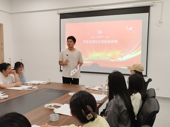 4月19日下午,在迎接“五四运动”106周年之际,国际经贸学院学生会以“承五四薪火,绘青春山河”为主题,创新性地将非遗拓染技艺与红色文化教育相结合,举办了一场别开生面的主题风采展示活动。活动通过艺术创作、历史教育与环保实践的新颖结合,生动诠释新时代青年传承革命精神、赓续文化根脉的使命担当。本次活动共有来自各个学院的30余名学生参加。