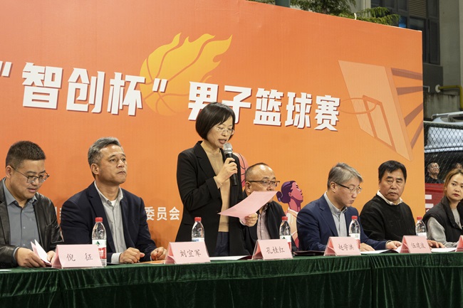 南京高职园管委会党工委副书记、管委会主任孔桂红宣布第四届“智创杯”男子篮球赛正式开幕。