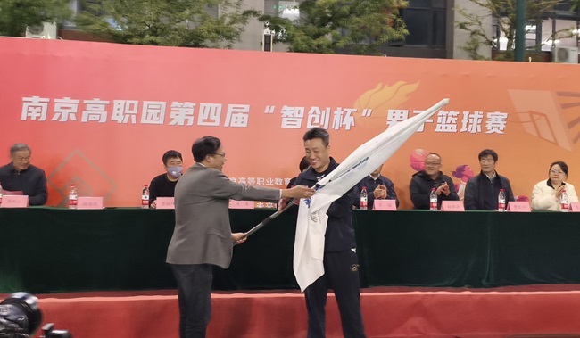 闭幕仪式上举行了会旗交接,杨军副院长与南京理工大学紫金学院校长助理徐春燕交接了“智创杯”赛旗,标志着第五届“智创杯”男子篮球赛将在南京理工大学紫金学院举办,体现了南京高职园校际体育交流与合作精神的传承与发展。