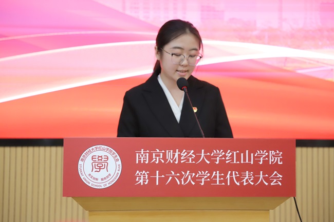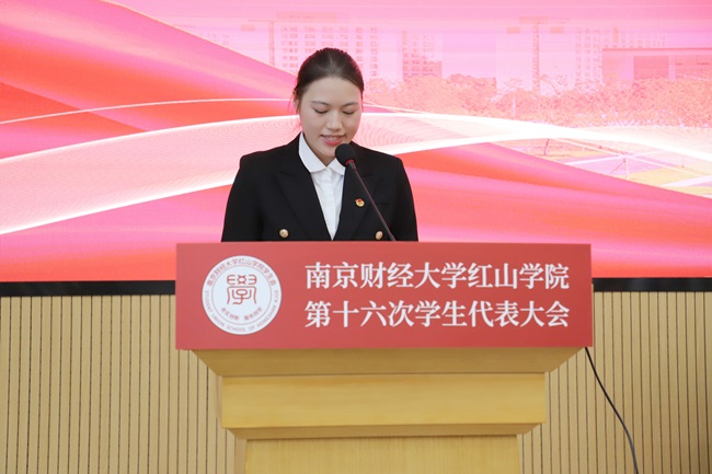 南京财经大学学生会主席团候选人王佩馨致辞。她期待新一届学生会传承优良传统,在服务同学上精准务实,在校园建设中主动作为,引领广大青年在强国伟业中贡献青春才智。