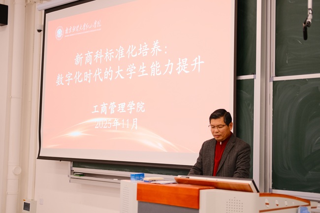 为帮助学生了解数字化时代商科人才发展趋势,明晰新商科标准化培养体系,11月26日下午,工商管理学院于启智2区101教室举办以“数字化时代的大学生能力提升路径”为主题的专题讲座。工信部人才交流中心产业赋能人才基地大数据研发中心主任夏东,江苏领航大数据有限公司经理李昭颖、随行人员付璟珩,南京领航航模科技有限公司副总经理李国、技术总监刘玫文,南京业阳人力资源服务有限公司总经理黄镜怡、随行人员吕玉霞参加。工商管理学院党总支书记、院长张太海,党总支副书记王海萍,团总支书记何玉凤以及近200名学生参加。
