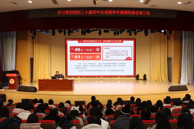 12月3日,我院在鹿鸣剧院举办学习贯彻党的二十届四中全会精神专题辅导报告会,特邀江苏省企业联合会会长李琨作专题辅导。学院党委书记孙彬,院长李连军,党委副书记、副院长王晨婷出席,金融税收学院全体师生党员、党的发展对象和入党积极分子代表参加会议。报告会由王晨婷副书记主持。