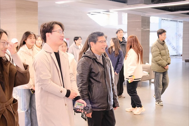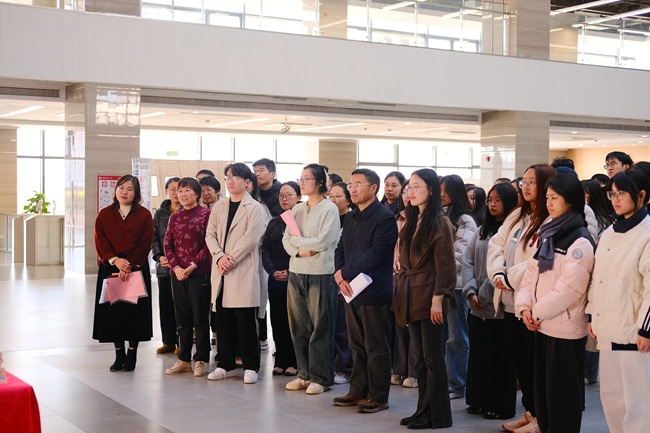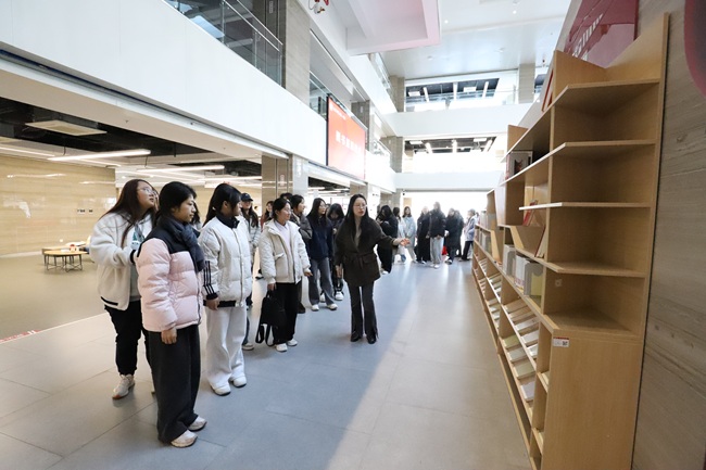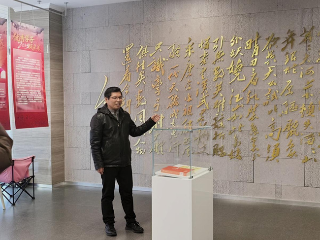 仪式结束后,在工商管理学院党总支副书记王海萍、图书馆工作人员徐爽老师的带领下,大家前往参观文化长廊及红色背景墙。在毛主席《沁园春·雪》主题画作前,张太海院长驻足讲解,结合“俱往矣,数风流人物,还看今朝”的豪迈诗句,阐释共产党人精神谱系中坚定的革命信念与乐观主义精神,将知识传承与红色教育深度融合。